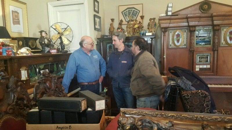 Don Teach (left, in light blue jean shirt) Antique Emporium Owner and Nickelodeon Piano Collector (just between us, I believe there are fewer than 8 of these pianos in the world left), Mike Wolf of “American Pickers“ (center, navy jacket), and Frank Fritz of “American Pickers” (right, brown jacket).